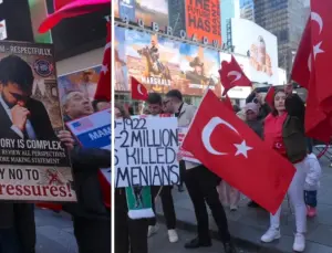 “Bring them home now” (onları çabuk konuta getir!) yazılı pankart ve kıyafetlerle Gazze kasabı Netanyahu’ya reaksiyon gösteren protestocular, İsrail’in Gazze’ye yönelik taarruzlarının durdurulmasını ve Netanyahu’nun istifasını talep etti.